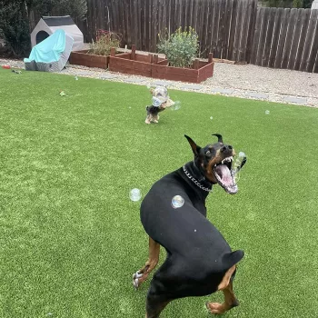 My puppy loves this! We play in the backyard all the time. I just wish I didn't have to dip it so often to make bubbles. But other than that, it's so much fun!