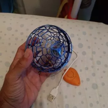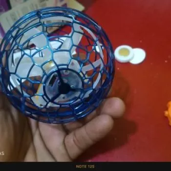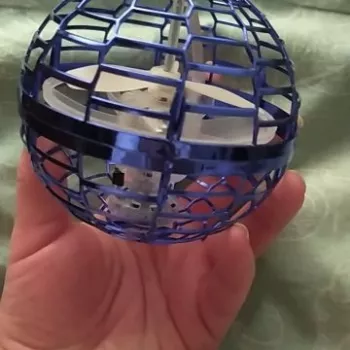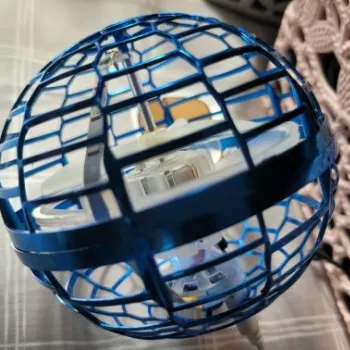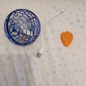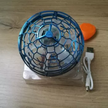 It is so nice, working as specified. I took the photo when it was upside down, otherwise it would fly and escape the camera. The provided remote control is for start/stop. It cannot really fly very high, and the flight cannot be controlled, but it is lots of fun for children. It is suitable for the living room, as it is quite mild when bumping on things. It is packaged in a strong box.